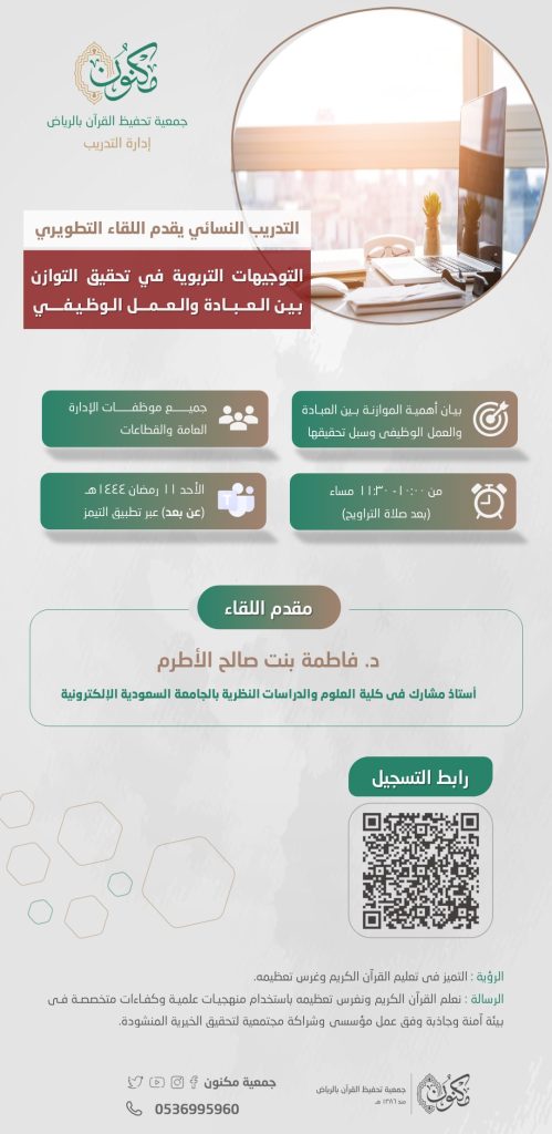 سعيًا لتحقيق رؤية الجمعية ورسالتها، تواصل إدارة التدريب ممثلة بالتدريب النسائي تقديم الفرص التدريبية والتطويرية لرفع مستوى النمو المهني لموظفات الإدارة العامة والقطاعات في الجمعية، حيث نفذت مساء الأحد الحادي عشر من شهر رمضان المبارك اللقاء التطويري الثاني بعنوان التوجيهات التربوية في تحقيق التوازن بين العبادة والعمل الوظيفي” والذي يهدف إلى بيان أهمية الموازنة بين العبادة والعمل الوظيفي وسبل تحقيقها.